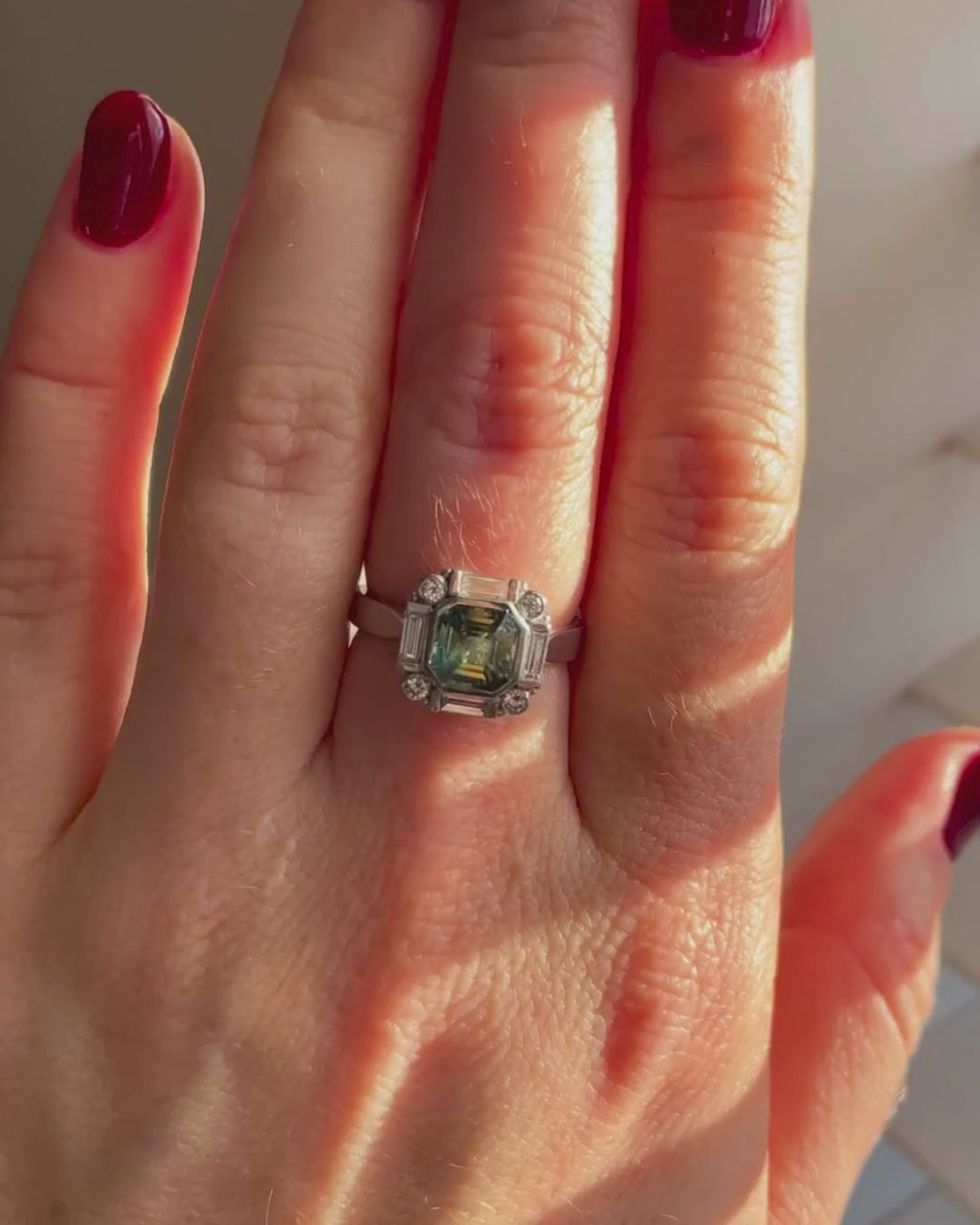 One for the green lovers ~ a green sapphire with flickers of teal. We love asscher cut stones because they really do show off the life and colour of a stone. Set in a border of brilliant white baguette and round brilliant cut diamonds with gorgeous Platinum to really bring out all the stones.