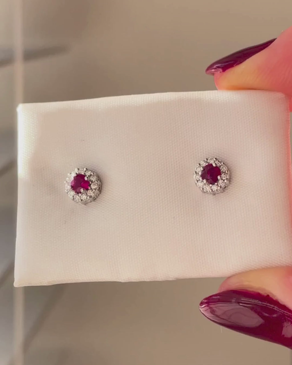 A staple ruby piece - fiery red rubies surrounded by a cluster of brilliant white diamonds. The rubies flash rich, deep red hues as they catch the light and the white diamonds add that pop of sparkle that is hard to resist. The perfect everyday stud.