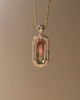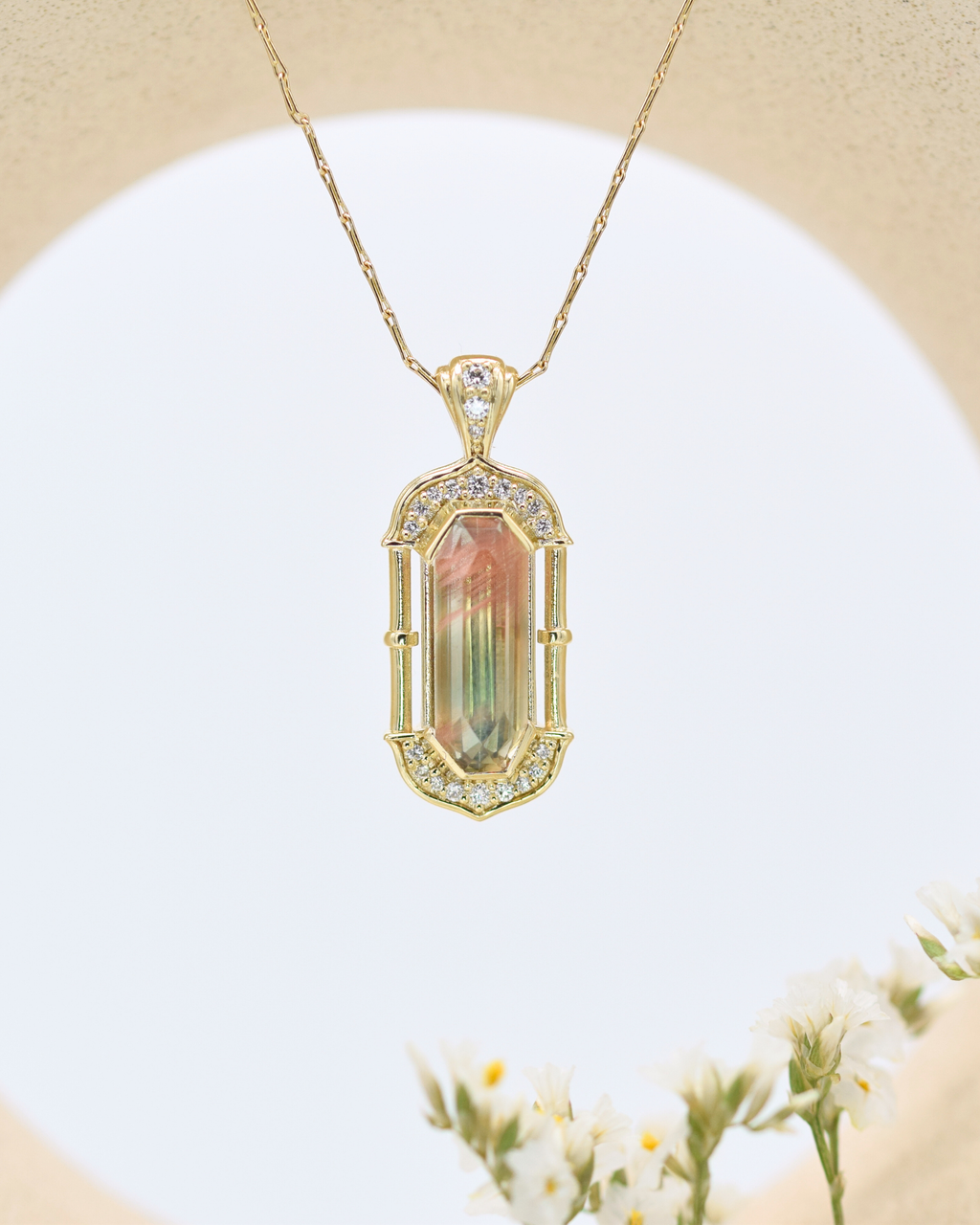 The design of the pendant was inspired by the architecture around Bristol, where the sunstone was found amongst hundreds others at a local gem show. The shape of the pendant drawn from stain glass windows with their decorative, intentional framing.
