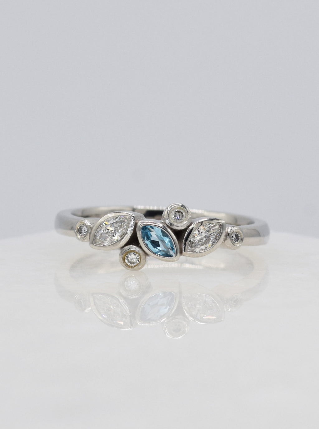 Exploring a possibility of designs with marquise stones, our team fell in love with the fluid scattering of these stones, with the delicate touch of blue from the topaz sitting beautifully next to the array of white diamonds.