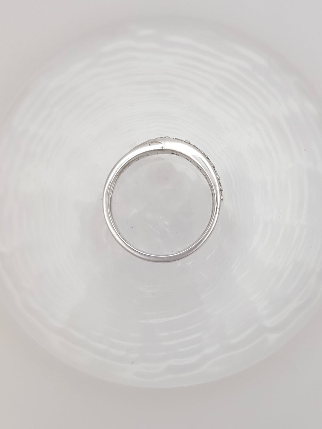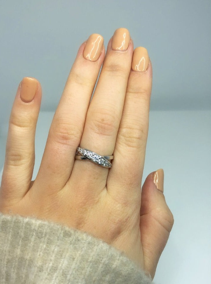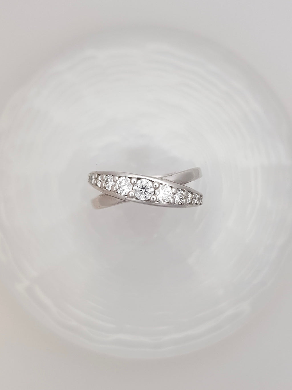 One of our more popular dress rings, featuring varying sized diamonds on one band and a second plain band crossing under. We love this ring for its wonderfully bright dazzle of diamonds and its ability to perfectly nestle amongst the fingers.