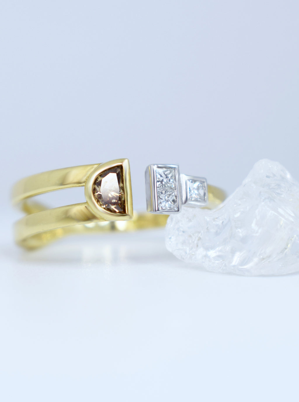 18k Yellow Gold | 18k White Gold Bezel | Half Moon Chocolate Diamond | Princess Cut Diamonds
