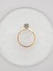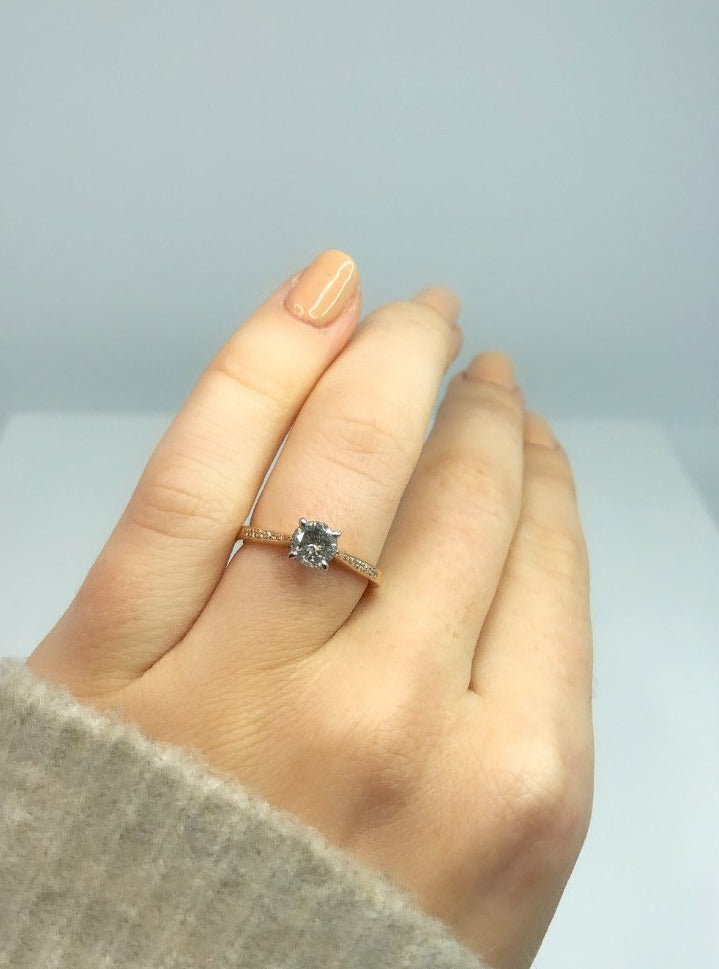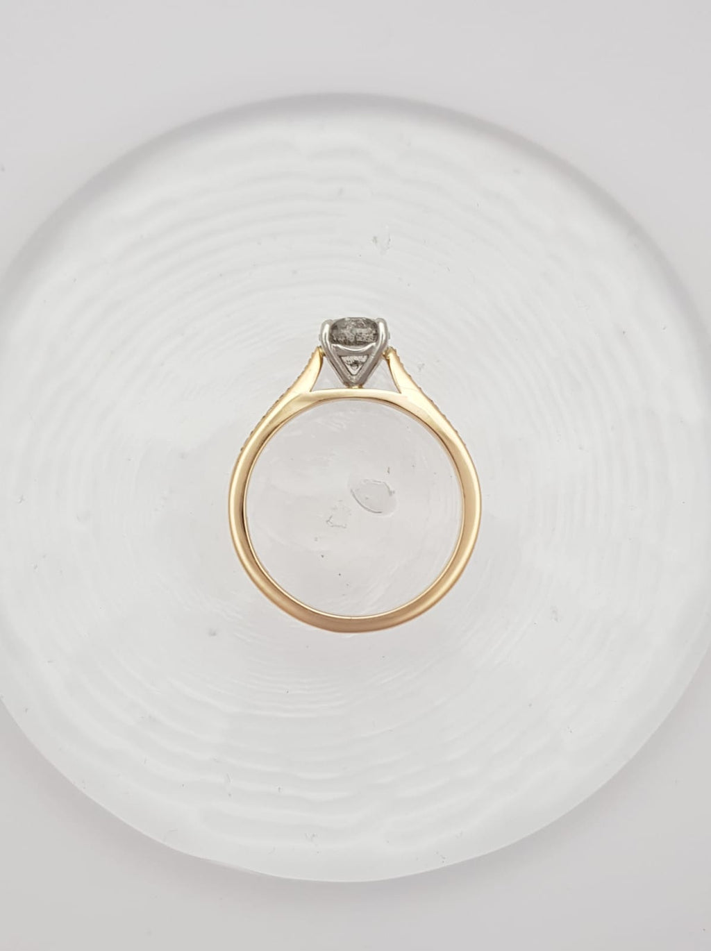 A salt and pepper diamond is a diamond with inclusions that appear black and white; to us they seem as if they're holding small internal galaxies - every stone's unique. We decided to give this stone a classic style with a modern spin by setting it in a white gold with rose gold diamond set shoulders.