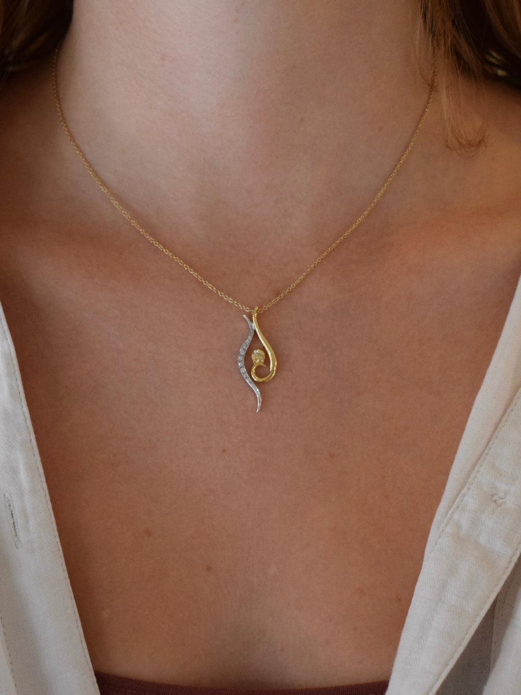 We designed this pendant with a natural organic flow in mind, the two tones of gold frame the sitting centre stone perfectly to make this a wonderfully elegant pendant.