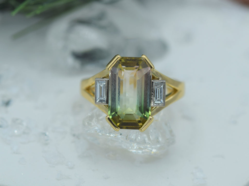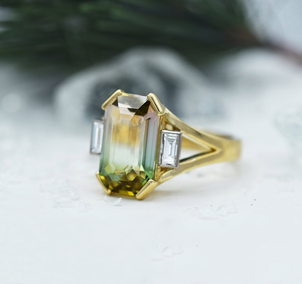 18k Yellow Gold | Emerald Cut Watermelon Tourmaline | Baguette Cut Diamonds