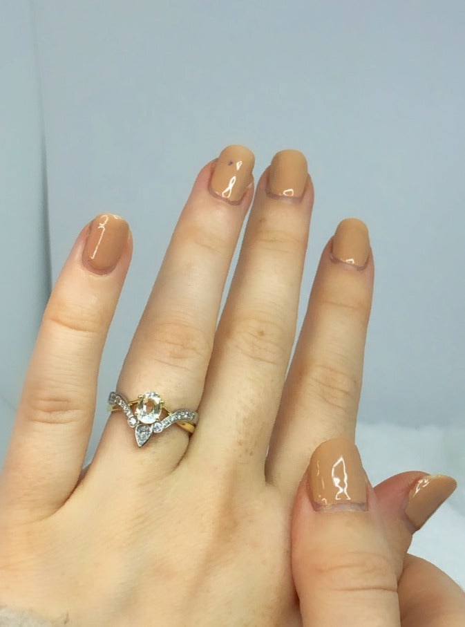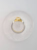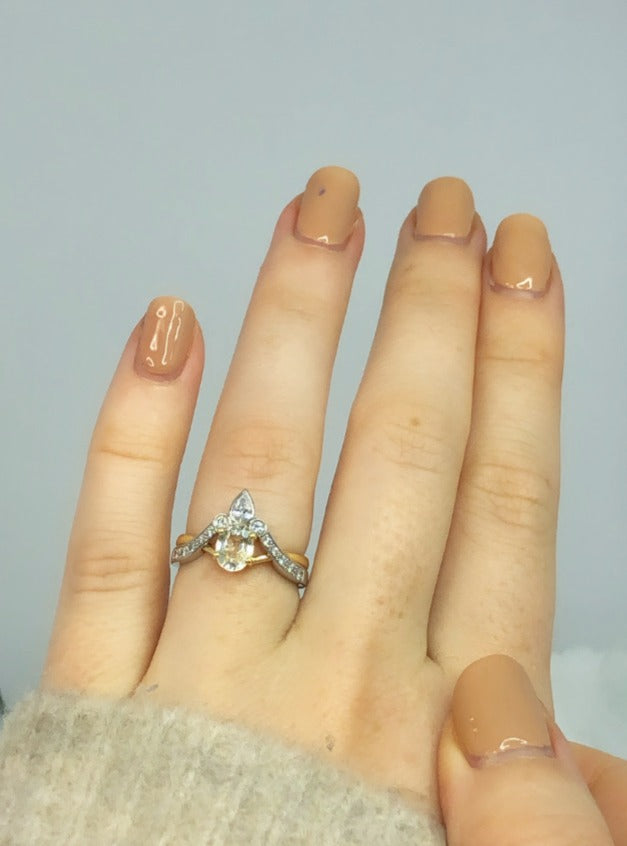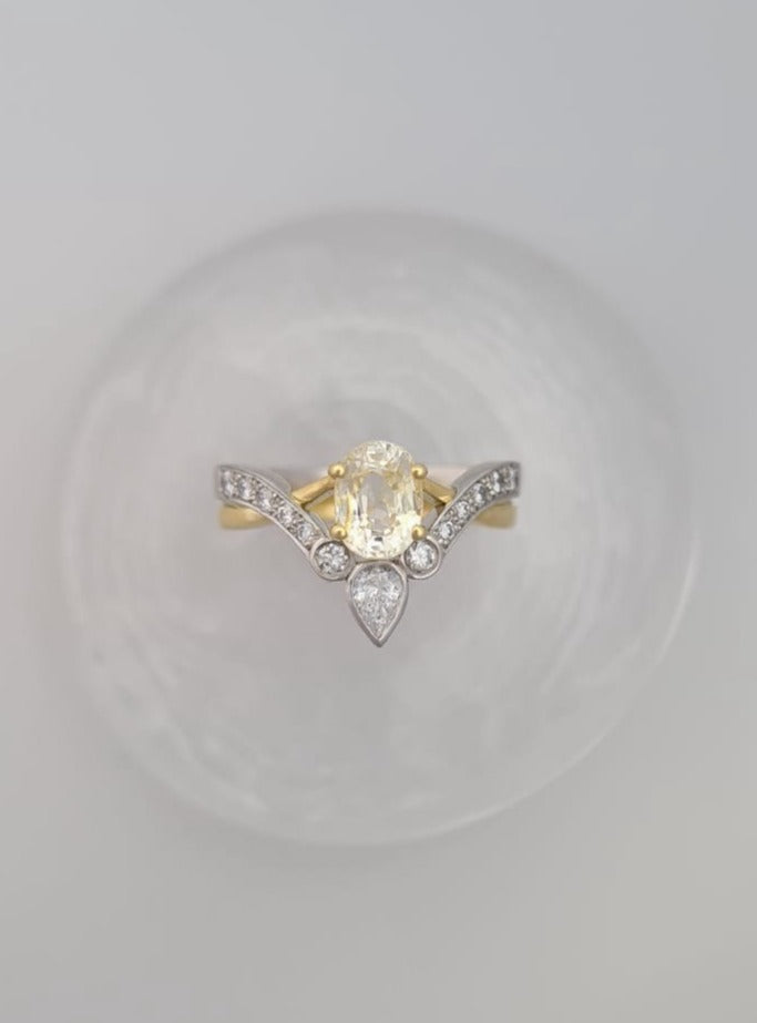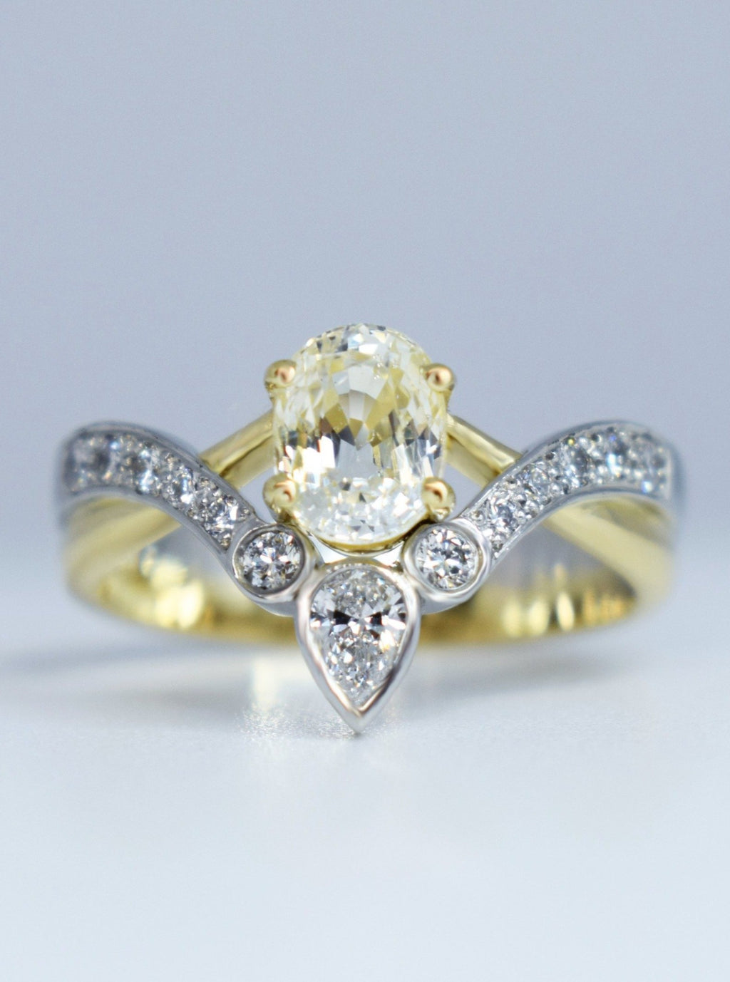 A stunning design celebrating this gorgeous pastel yellow sapphire. The entwining white and yellow gold bands create a gorgeous flow to the ring that creates a regal and magical look. With the added value of appearing like two different rings, it looks divine with the diamonds sitting either above or below. You decide which look steals your heart the most!